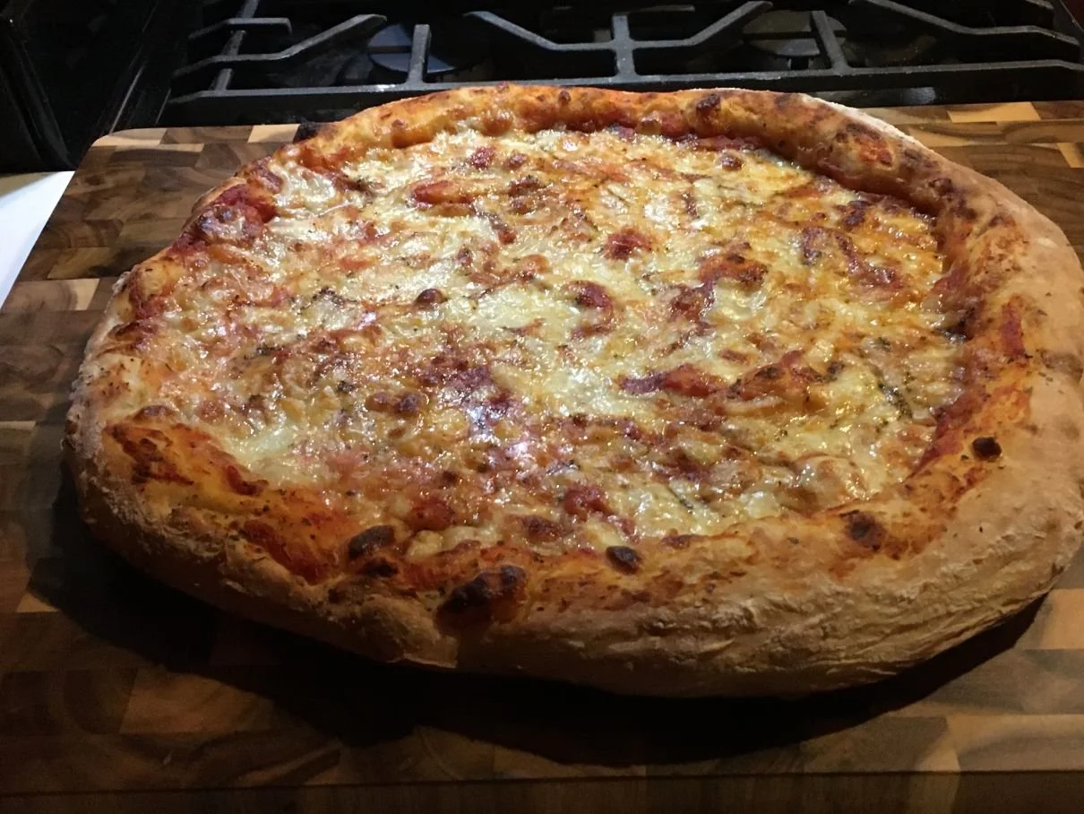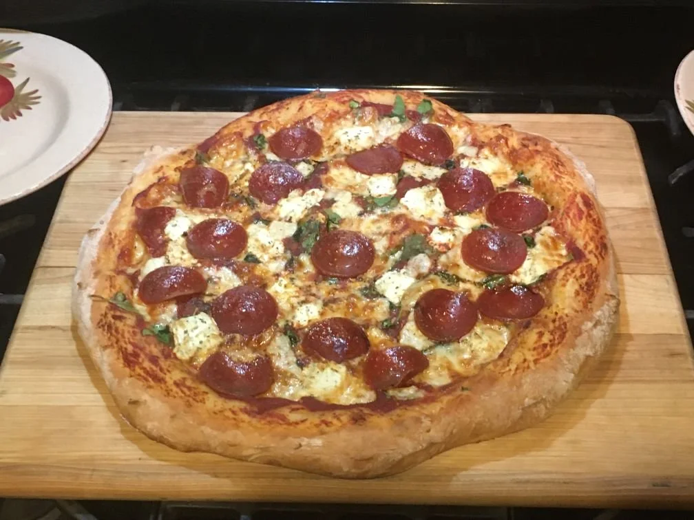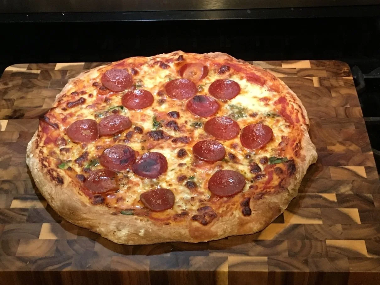 To prepare, use copious amounts of flour on the counter to make a round shape. Do not roll. Line pizza pan with parchment for guaranteed no-stick results. Twirl and stretch until dough is at edge of pan. Do not press the edges of the dough. Spread your toppings. Bake on lowest rack at 450 for 10 minutes. For crunchy crust, slide pizza directly onto center rack for another 8-10 minutes at 400. For softer crust (why?) keep on pan and put on center rack.
