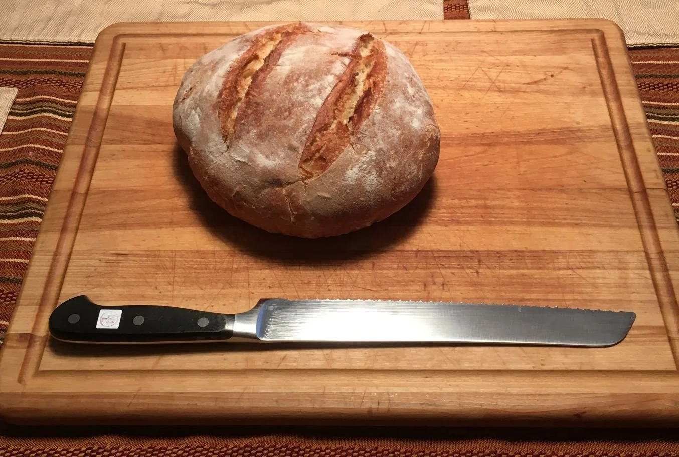Flour the top of the dough. Slash the dough. Place/drop the pie pan into the very hot cast iron pot. Cover it. Place on center rack. Bake for 25 minutes. Uncover. Lower to 375 degrees for a gentler brown—the sugar makes the bread brown faster, so go lower and slower with the heat to get a thicker crunchy crust.