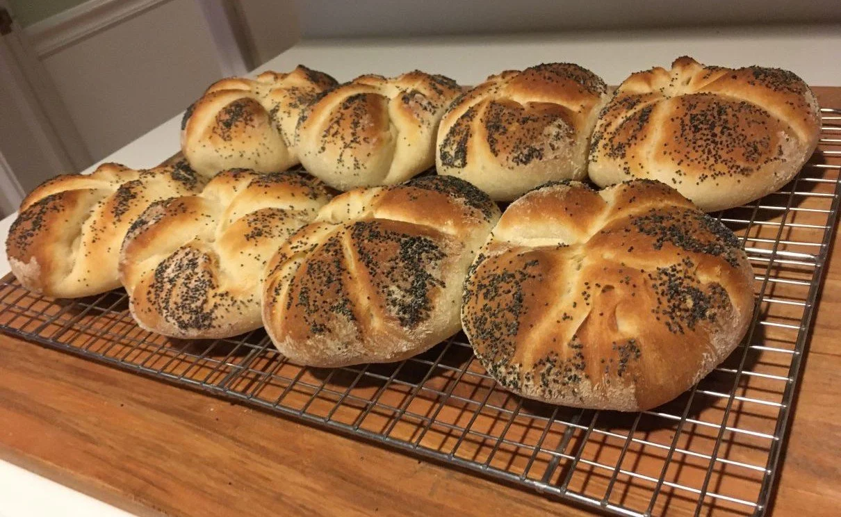 Basic recipe plus onion flakes sprinkled onto dough just before backing. Brush dough with water to help the flakes stick. Egg wash does a better job but changes the final finish to a gloss.
